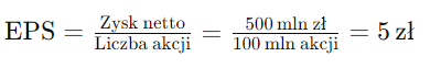 Krok 1: Obliczanie EPS Zysk netto spółki ABC wynosi 500 milionów złotych, a liczba akcji wynosi 100 milionów. Zysk na akcję (EPS) wynosi więc:
